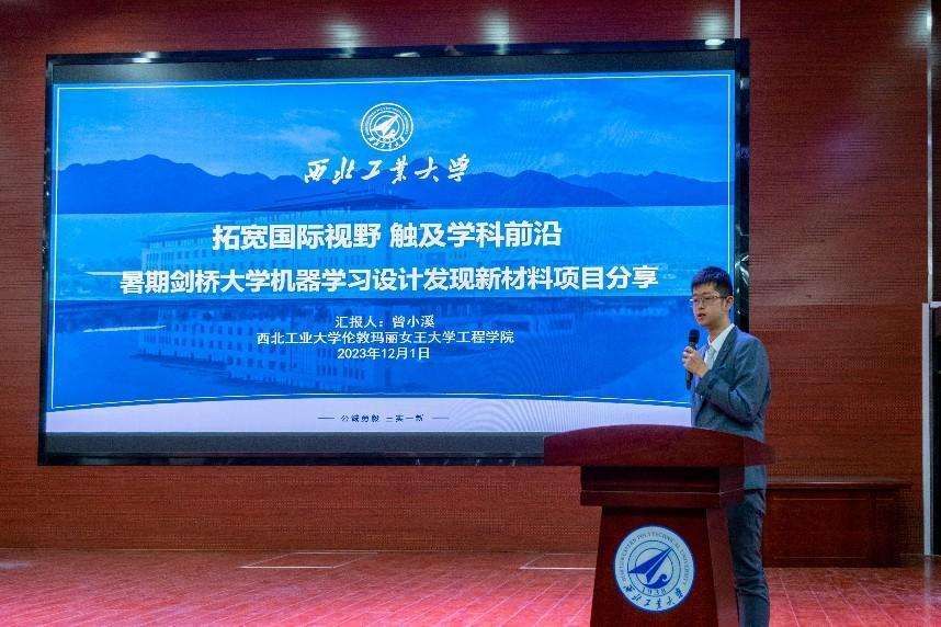 曾小溪结合暑期参与的剑桥大学设计发现新材料项目,讲述了自身的收获与提升。他指出“个人努力+团队协作=无限的价值”,建议同学们在提升个人能力的同时,要学会和不同的搭档合作。
