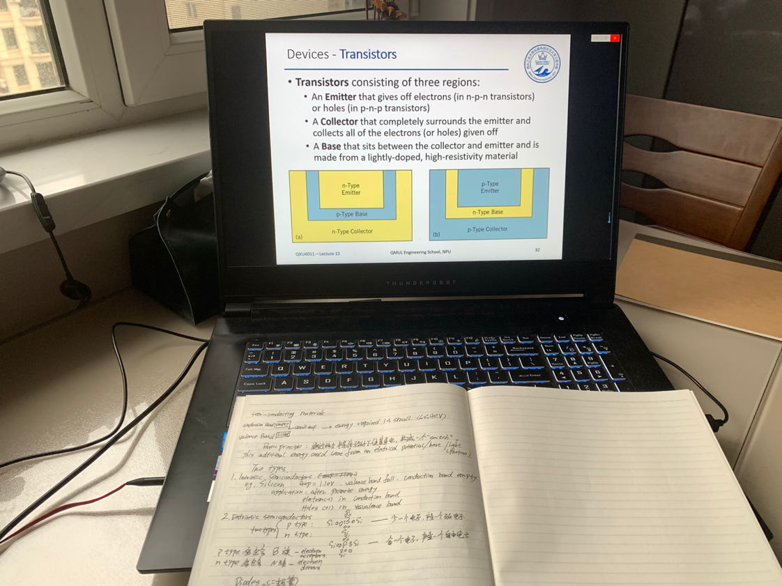 早晨八点半,第一节网课开始,尽管“雨课堂”出现技术故障,但是老师准备充分,瞬间就切换到另一套授课平台,保证了我们学习顺利开展。不得不说,这是一种很新奇的体验,明明同学们和老师远隔千里,但是通过这个小小的程序,我们又得以相见。网络环境偶有卡顿,但是老师很认真地讲授,严谨而又不失风趣,让本来因为网络问题而略感烦躁的我能坚持专心听课。