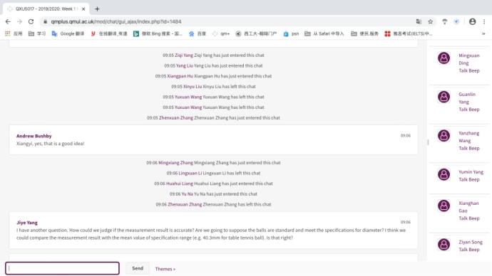 今天是新学期第一天开学,也是我在大学阶段第一次体验在线上课。我的第一节课是英国Andy Bushby教授的《材料学实验》,Bushby教授在线向我们发布任务,我们在阅读和思考的同时,可以随时在QM PLUS的livechat板块向老师提问,而且全年级的同学都可以参与讨论,气氛非常热烈。