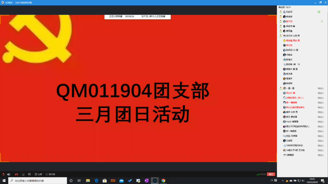 2020年3月16日至3月22日,williamhill中文官网2019级材料科学与工程专业共6个团支部,围绕“弘扬雷锋精神,树立抗疫榜样”主题开展了系列团日活动。本次活动由年级团支书邱泉润策划,宣传委员李璨、组织委员邓业川协同组织。在系列团日活动,同学们集体学习了习近平总书记的回信,交流个人体会,并分享战疫中身边的青年榜样典型事迹,进一步了解国家抗疫时间轴,对国内外疫情形势进行整体分析,深入学习雷锋事迹,领悟雷锋精神的时代内涵。