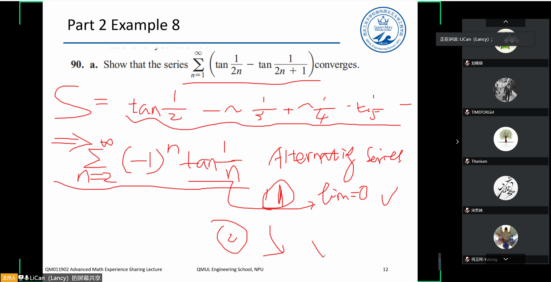 在学习方法分享中,李璨主要通过分享在高等数学中的基本学习方法与同学们进行交流互动。在例题展示中,李璨通过分享Chapter 11这一章中的典型题目,进一步讲述了针对具体题目的解题方法步骤,起到了良好的查缺补漏作用。最后,李璨通过对泰勒展开和麦克劳林级数等定理的分析,深化了同学们对这些著名公式定理的理解,增强了同学们对相关知识的的运用能力。在讲解过程中,同学们聚精会神听讲解,沉浸在数学逻辑的愉悦之中。
