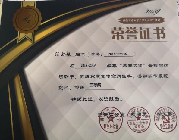 这就是荣获2020年西北工业大学十佳团支书的汪士超的青春寄语。