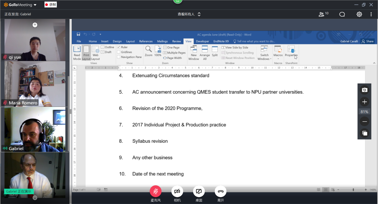 会议由Anthony Michael主持,他对所有参会人员的到来表示欢迎。与会人员回顾了第六次学术委员会会议内容并通过了上次会议纪要,讨论了因特殊原因员工无法参加考试或补考的标准,以及员工能否参加西北工业大学其他合作院校的交换生项目;随后范晓丽汇报了2020级员工培养方案、2017级员工毕业设计、生产实习以及课程教学大纲修订情况,讨论了英方专业课程考试模式;Andy Bushby对学业管理规定提出改进意见。最后与会人员确定下次学术委员会时间。