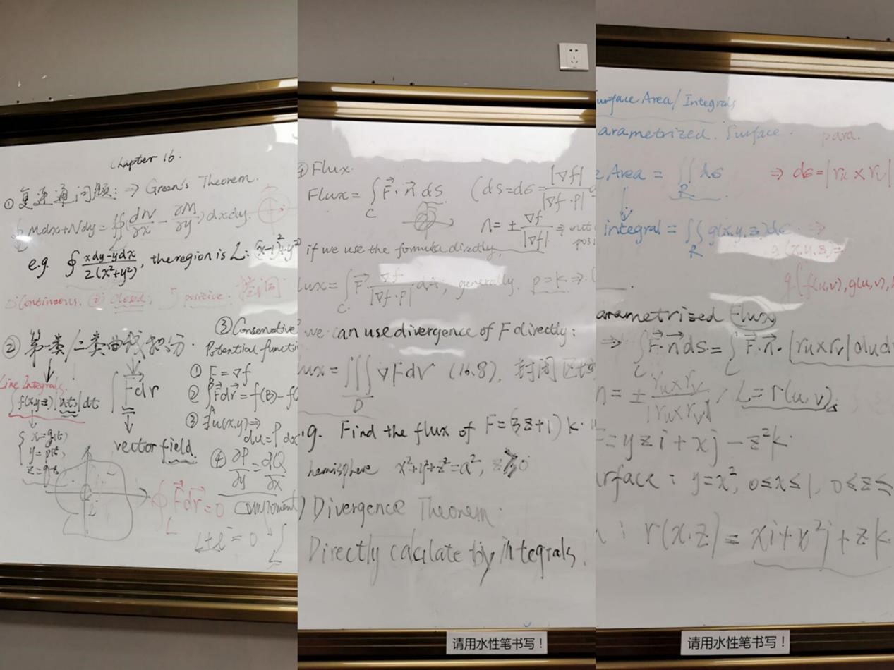李璨主要从高等数学备考方法、14章、16章重点内容两方面进行了讲解。对于备考方法,李璨提出,要重视课后作业的独立完成、同学之间的交流互助,将有限的练习效果最佳化,在平时的学习中就为考试积累足够的素材。在14章的讲解中,李璨重点讲解了梯度向量的推导及应用、切面、法线及线性化拟合的误差分析、临界点的判定、Lagrange乘子的推导及应用;在16章的讲解中,李璨重点讲解了高频考点:第一类、第二类曲线积分的应用及区分、保守场的判定与势函数的求解、复连通问题下的格林公式应用、曲面通量的三种解法、曲面面积的常规求法与参数化表示。
