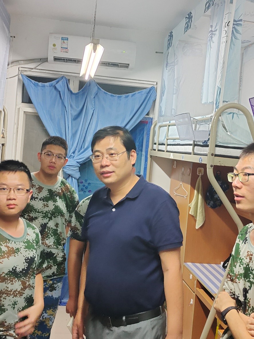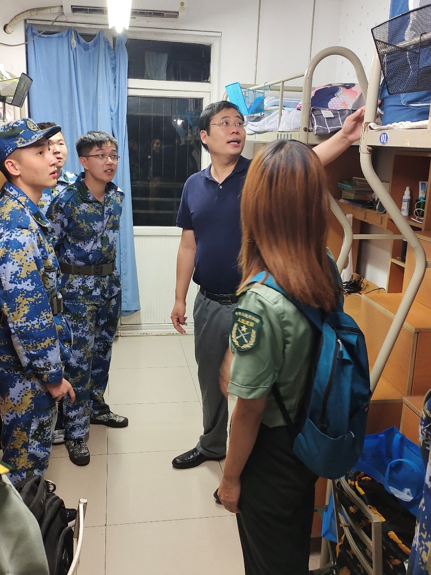 孔杰一行来到员工宿舍,正值员工开展内务规范教学活动。孔经理认真地查看了员工的内务卫生规范情况,亲切询问同学们的军事训练、学习准备和日常生活情况,并提出了中肯的建议。在员工宿舍中,孔杰经理与同学们进行了亲切的交谈,着重询问了大家的饮食习惯和住宿条件,尤其是训练安全和防暑降温工作情况,并和大家分享了自己刚进入大学时军训生活的体验和经历。