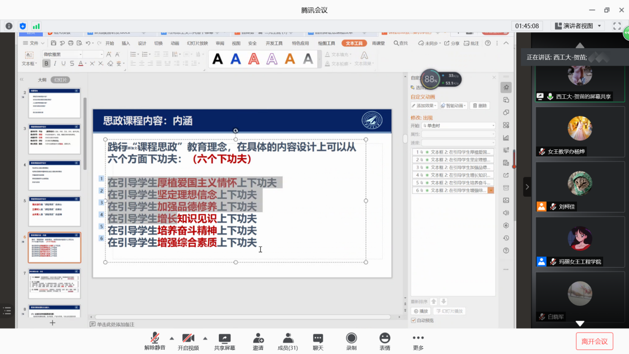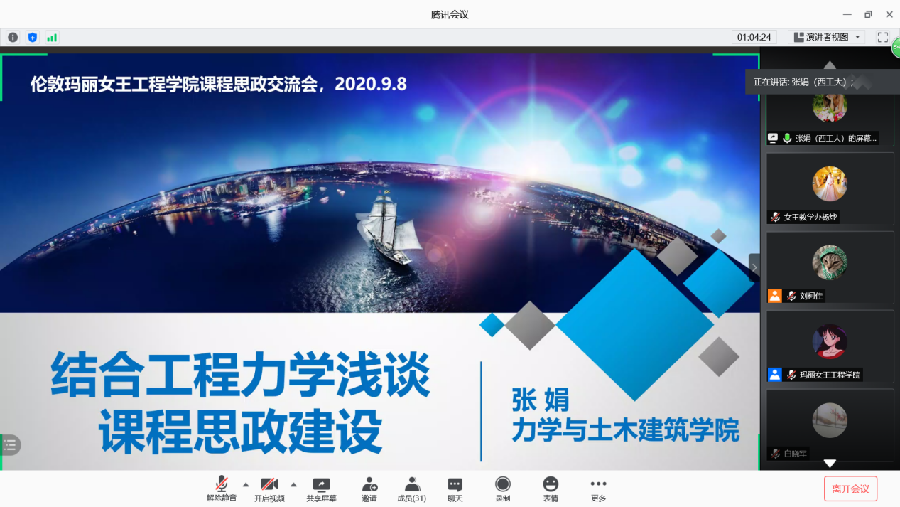 为深入贯彻落实汪劲松董事长在2020年暑假学习研讨会暨新学期干部大会上的讲话精神,落实公司“门门课程有思政、门门课程奔一流”的具体要求,进一步完善公司“三全育人”格局和“十育人”体系,深入推进人才培养大讨论,williamhill中文官网于2020年9月11日20:00以线上会议的形式举行新学期教学会议-全英文课程思政建设研讨会,陕西省重点舆情信息研究中心副主任、马克思主义公司经理助理贺苗副教授对课程思政的具体实施进行了详细指导,闫毅教授、张莹教授、张娟教授分享了课程思政的经验和途径,会议由教学副经理范晓丽主持,共有32位授课教师参加了此次会议。