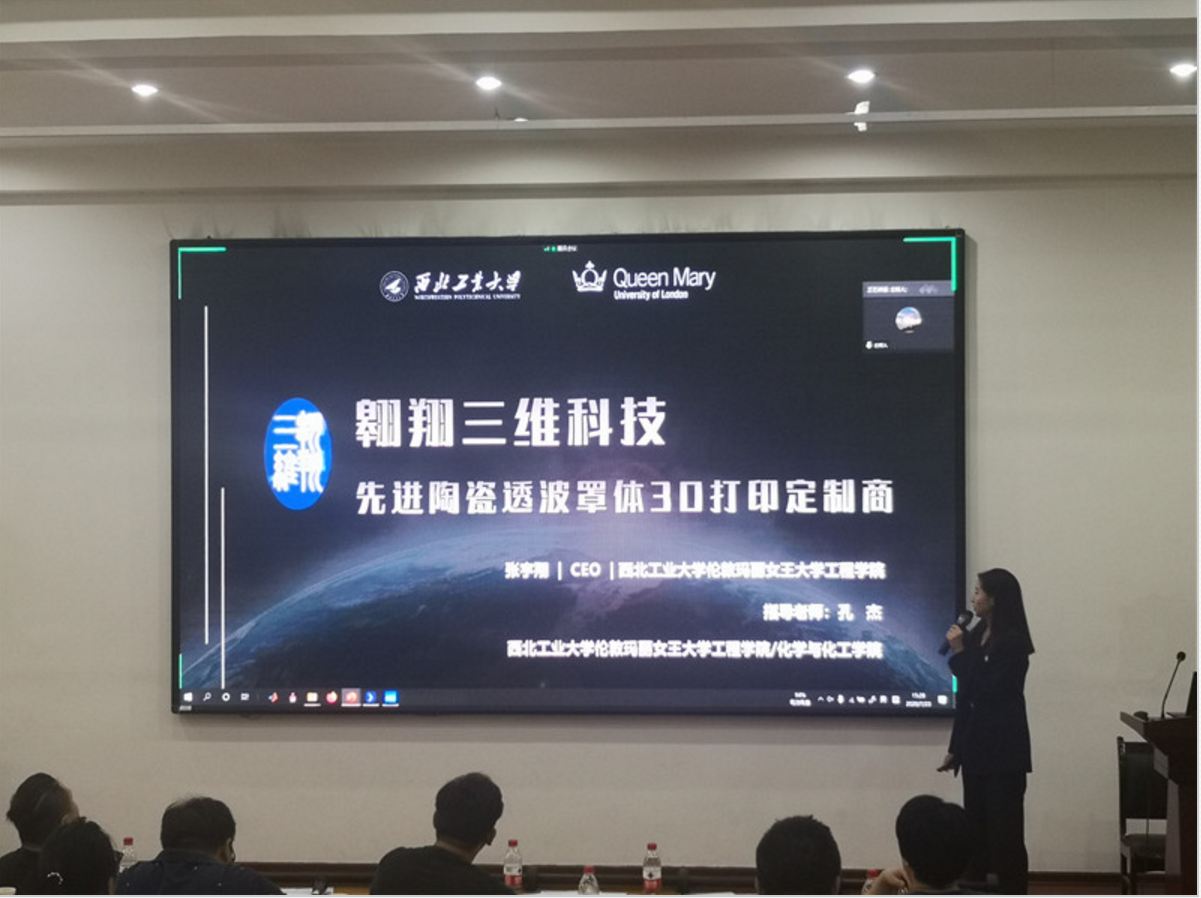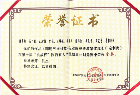 8月29日,由共青团陕西省委、中共陕西省委教育工委、陕西省科协、陕西省社科院、陕西省学联主办的第十届京东未来“挑战杯”陕西省老员工创业计划竞赛决赛顺利举行。公司2018级本科生张宇翔、马一然、王珺怡、金硕、刘烨锟、李沛珊、周锦阳、黄辰宇、吴笑宇、粟毅等同学的参赛项目《翱翔三维科技——先进陶瓷透波罩体3D打印定制商》在本次决赛中荣获金奖。