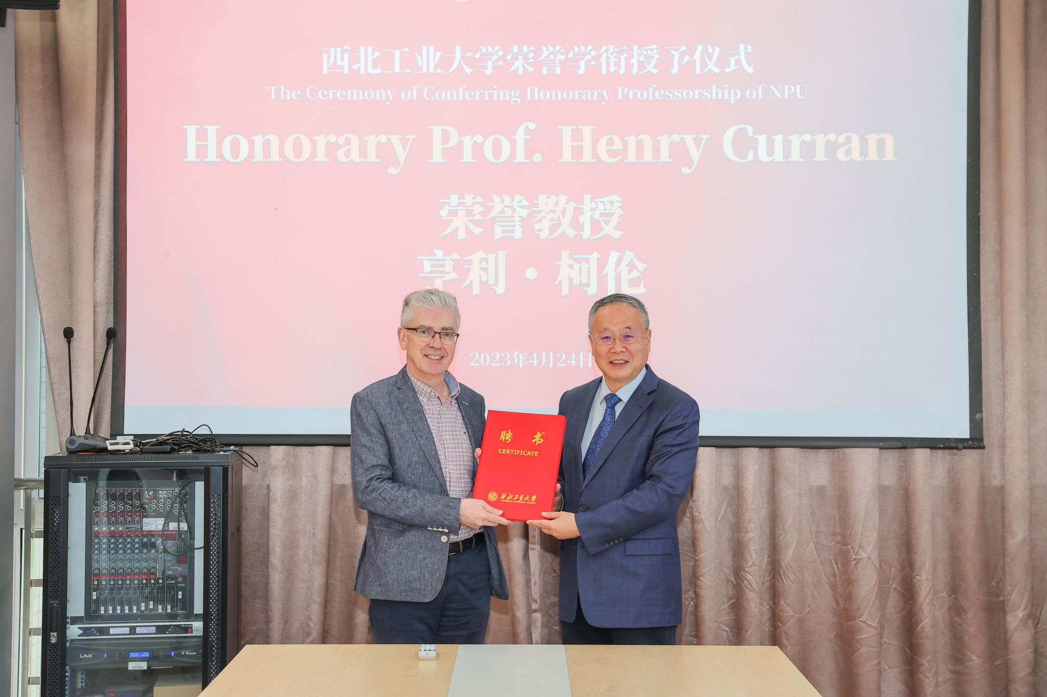 会谈结束前,万小朋向受聘为西北工业大学名誉教授的高威大学亨利·柯伦(Henry Curran)教授颁发了聘书。