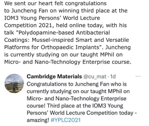 2021年,IOM3青年讲座比赛中国区决赛由williamhill中文官网承办。williamhill中文官网2017级本科生范峻丞以精彩的表现获得中国区决赛第一名,并代表中国参加IOM3青年演讲比赛全球总决赛。后赴剑桥大学深造的范峻丞一路过关斩将,在全球总决赛中获得第三名的好成绩,受到剑桥大学与伦敦玛丽女王大学官网的关注与报道。