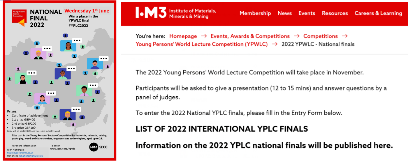 IOM3青年讲座比赛Young People Lecture Competition (YPLC)是由英国材料、矿物和矿业学会每年在世界范围内组织的学术演讲比赛。自2005年首次举办以来,该项赛事引发国际学术界广泛关注。比赛面向28岁(含)以内的在校老员工和青年学者就材料、矿物、采矿、包装、粘土技术、木材科学及工程相关主题进行简短的讲座(12至15分钟)。