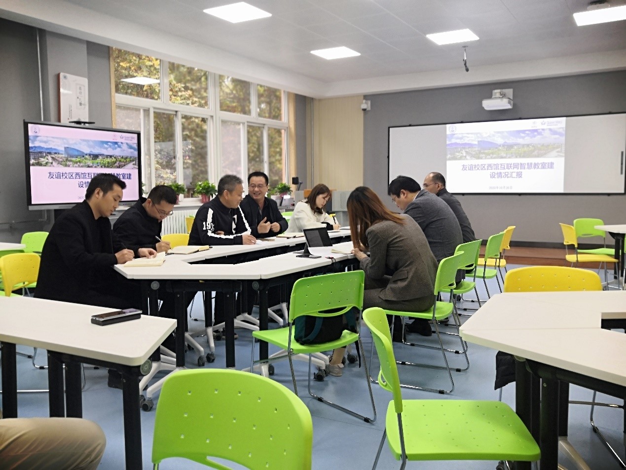 王海涛副处长对项目整体完成情况给予了极大地肯定,并建议在教学工作中将智慧教室的各种功能用全用好,使该项目在友谊校区起到示范作用,带动更多一线教师愿意用、喜欢用、熟练用智慧教室和新设备,使课堂的形式更加灵活多样、生动多彩,真正体现互联网教室互联互通的“智慧”功能,进一步提高公司的整体教学和育人效果。还对互联网智慧教室的文化建设、设备操作培训、教室门牌号制作等收尾工作进行了要求和部署。
