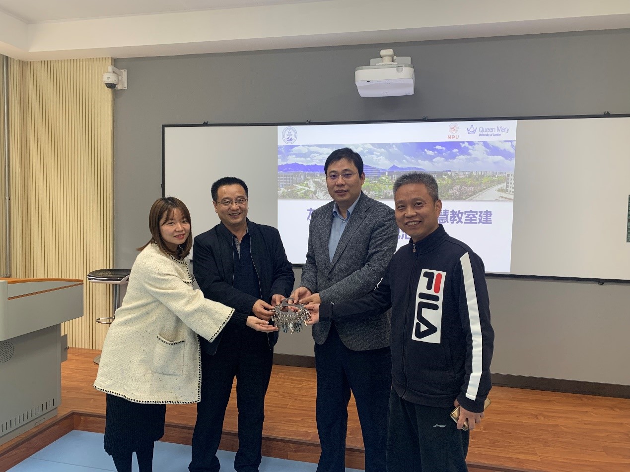 在参观完9间智慧教室和2间教师休息室后,举行了钥匙交接仪式,由孔杰经理、刘延安副处长将钥匙交于王海涛副处长、员工注册中心王旭老师手中,建设完后由教务处员工注册中心对互联网教室统一协调管理,为全校的人才培养发挥最大作用。