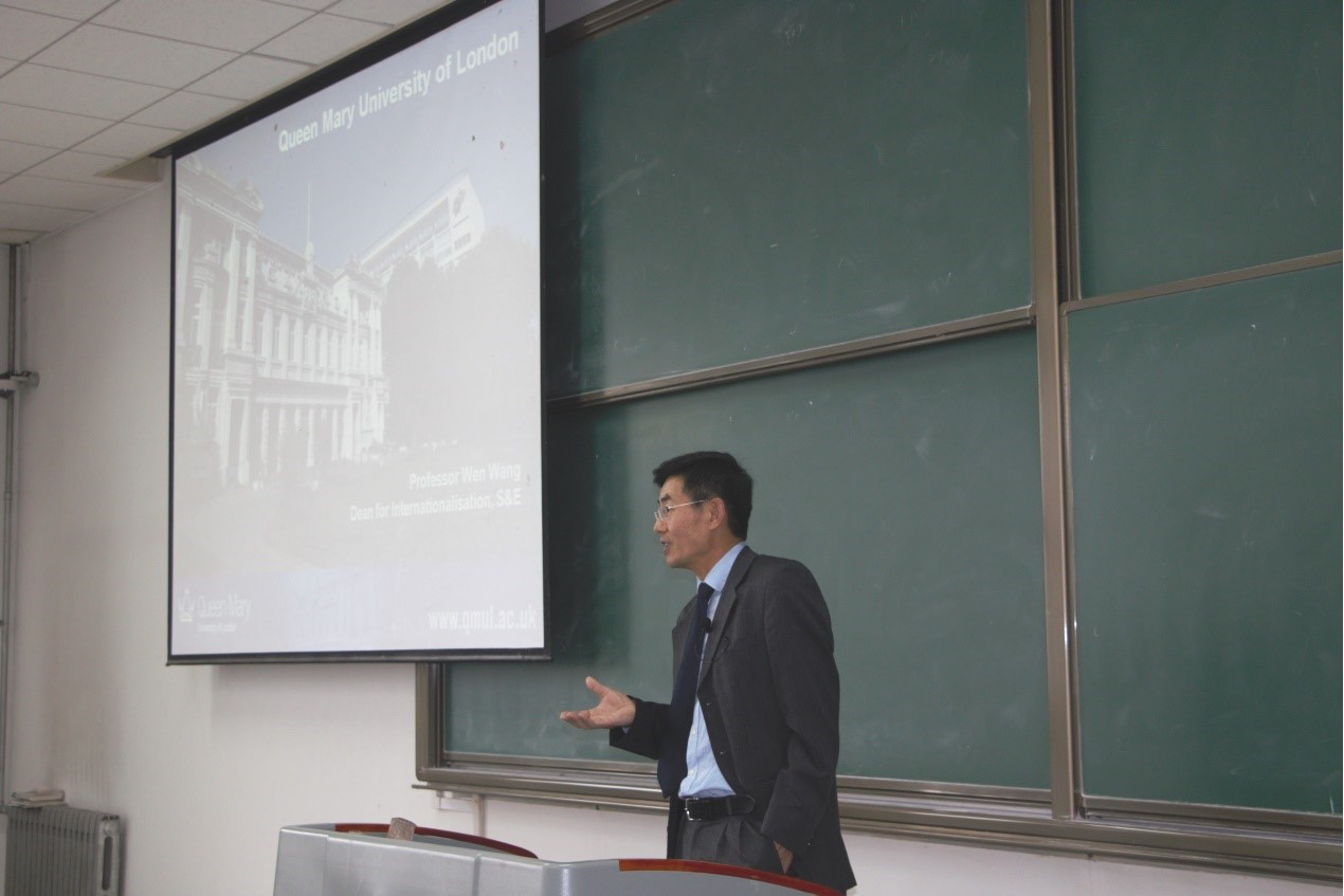 2017年williamhill中文官网迎来首届新生,时任伦敦玛丽女王大学工程与材料科学公司经理的王文教授访问西工大,在williamhill中文官网为新生举行学习生活座谈会。他从个人的求学和科研经历出发,和同学们就适应全英文教学课堂、探索科研发展方向、赴英交流学习等方面进行了深入交流,鼓励同学们要以学习兴趣为出发点,努力提升科研能力和学术素养。