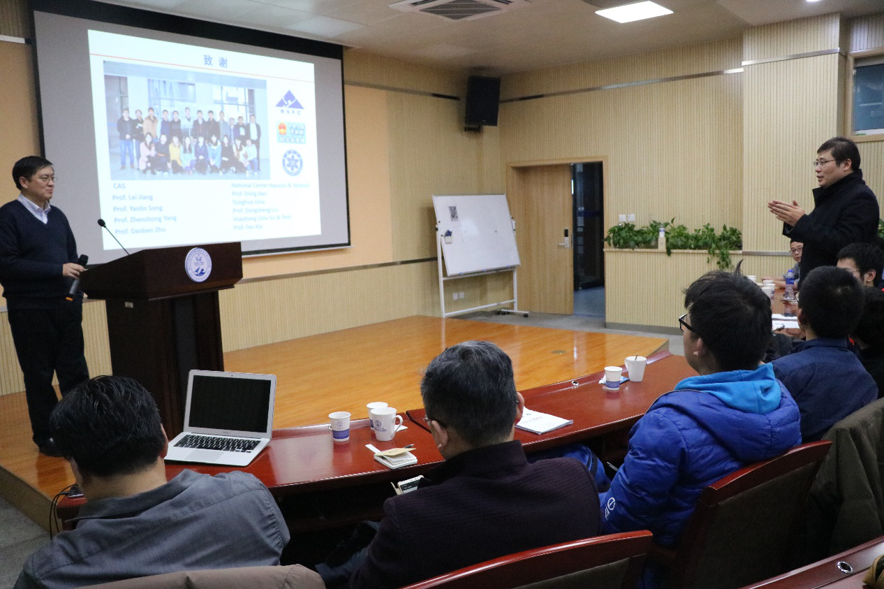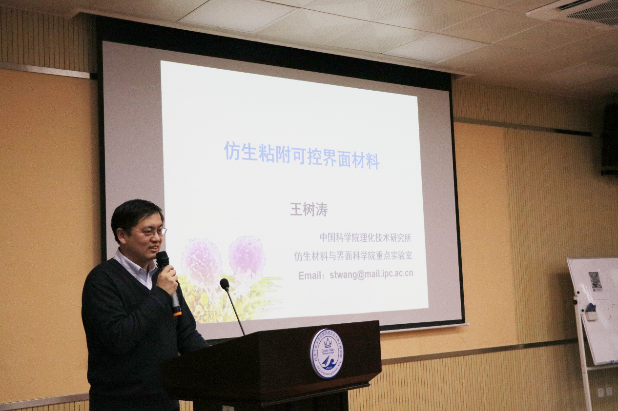 随后,王树涛研究员带来了以“仿生黏附界面材料”为题的学术报告。通过蜻蜓、羽毛等例子简单介绍了其所从事的仿生多尺度粘附可控界面材料的研究,并且介绍了抗粘附界面材料、高效粘附、生物特异识别粘附界面和器件以及疾病早期诊断等方面研究。