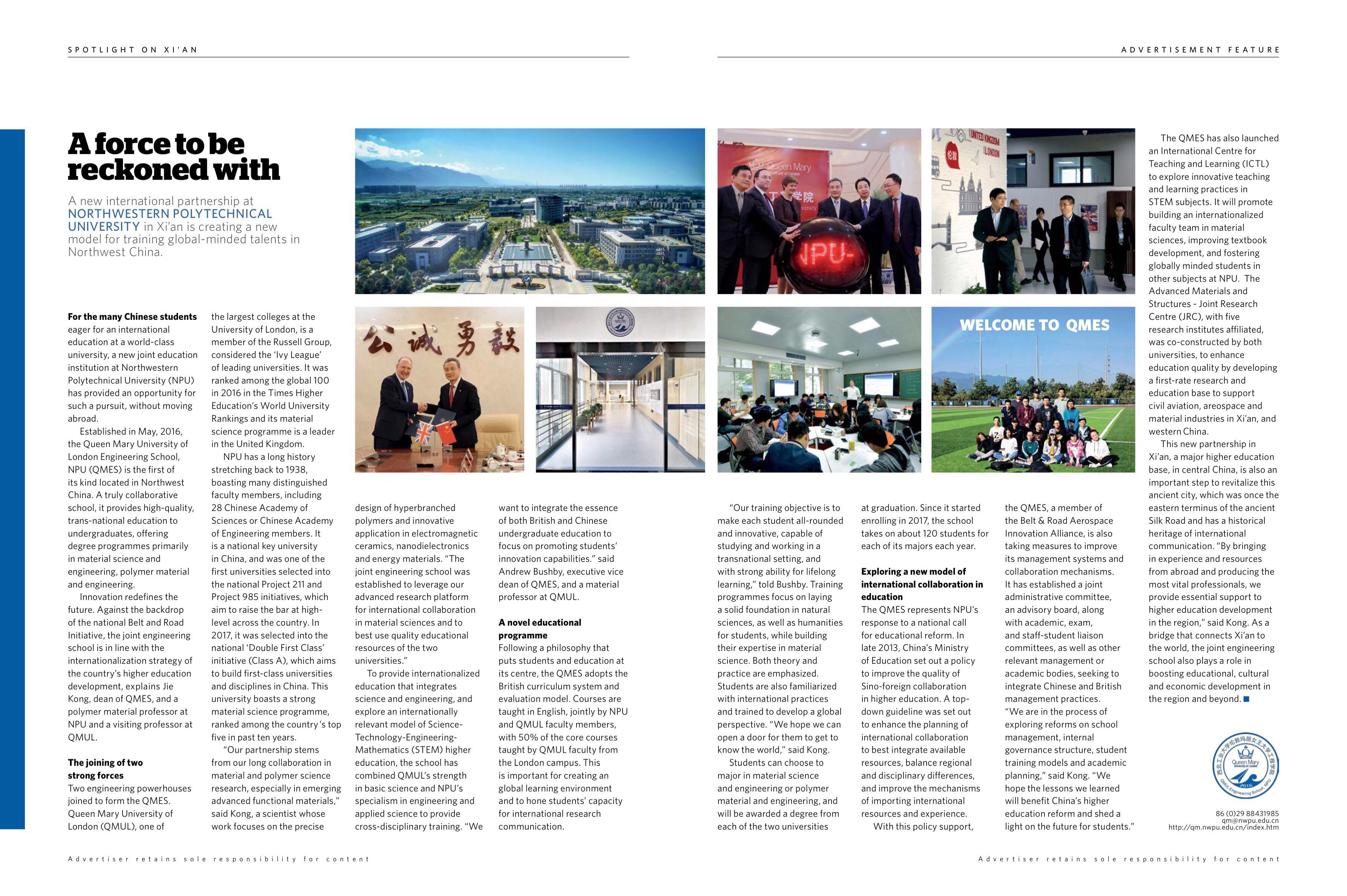 A force to be reckoned with一文开篇指出:西北工业大学长期致力于培养高端国际化人才,她的一项崭新计划“中外合作办学机构QMES”正在中国西北地区蒂落绽发。QMES于2016年10月揭牌成立,作为落户西北地区的首家非独立法人中外合作办学机构,QMES提供高质量的本科创新教育。QMES经理孔杰,西北工业大学高分子材料学科教授兼伦敦玛丽女王大学客座教授表示:“创新定义未来,在国家‘一带一路’倡议背景下,QMES充分响应和服务于中国高等教育的国际化战略。”对于众多渴求接受世界一流大学教育的华夏学子而言,这所新兴的中外合作办学机构为其提供了适逢其时的珍贵机遇——在本土即可享受优质的国际化教育。QMES之蒂落绽发,得益于两校强大的创新教育实力和历史积淀,公司明确的战略模式及管理层高效的执行力。