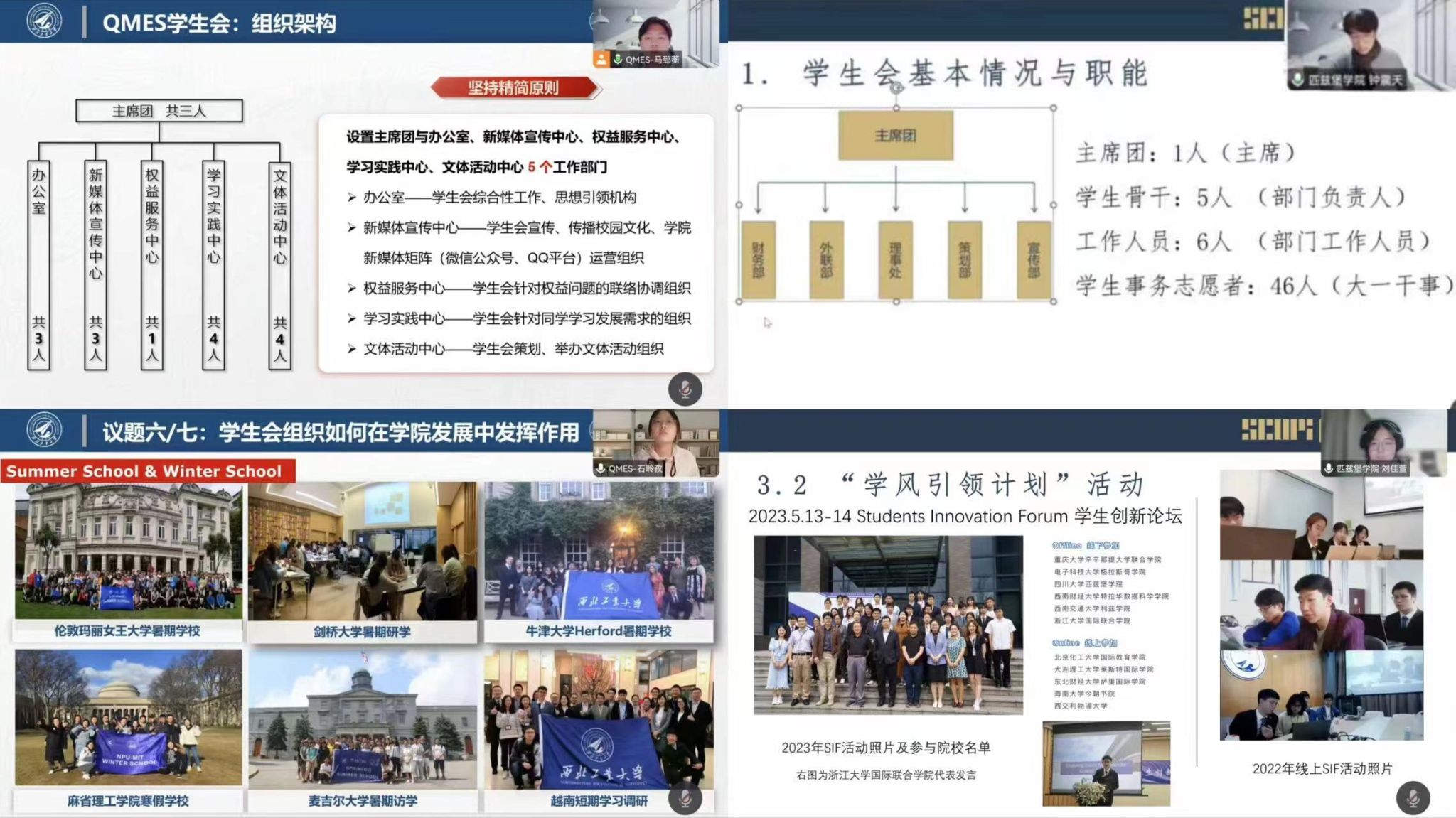 其次,马郅蘅分别从组织架构、改革成效、内部建设、宣传矩阵、服务同学、精品活动、工作成效及工作计划等角度介绍了公司员工会的基本情况。接着,四川大学匹兹堡公司员工会主席钟震天和大连理工立命馆大学国际信息与软件公司员工会主席团成员宫照堰分别就文体活动、员工创新论坛和团队建设、思想成长等方面分享了公司员工会的工作经验,其中四川大学匹兹堡公司员工会还重点介绍了“我为同学做实事”的具体案例。