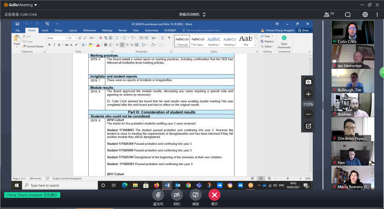 williamhill中文官网于2021年2月4日17:00通过线上会议的形式召开了2020-2021学年秋季学期期末考试委员会。参加此次会议的有,williamhill中文官网副经理范晓丽教授、伦敦玛丽女王大学Colin Crick教授、执行副经理Andrew Bushby教授、校外委员葛文杰教授、刘峰教授、Tim Bullough教授,本学期各门课程负责人,以及中英双方教学办公室工作人员。此次会议由Colin Crick教授主持。