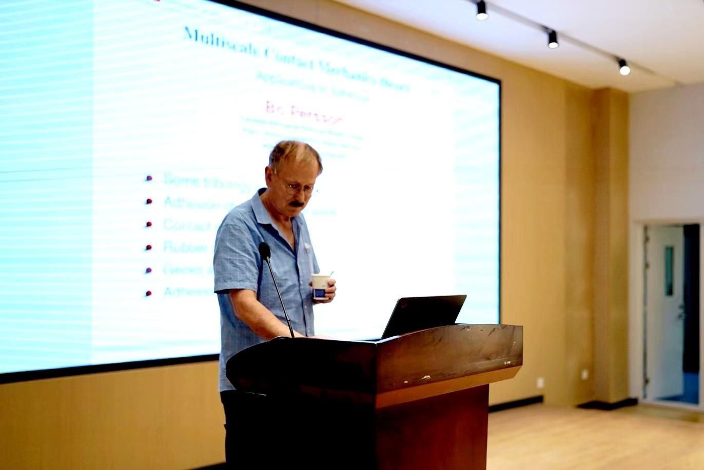 在讲座中,Persson教授围绕聚焦于接触物体的表面粗糙度进行了详细讲解,涉及到几乎所有固体物体的表面粗糙度,跨越了从纳米级至整体尺寸等多个数量级的尺度范围,这给数值方法(如有限元方法)的应用带来了不小的挑战。为此,Persson教授团队研发了出解析接触力学理论,能够全面覆盖并考虑到各种相关长度尺度带来的影响。他为同学们详细阐述了这一理论的定性特点,以及如何在实践中得以运用。
