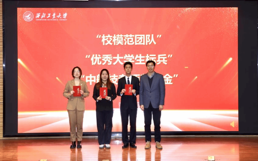 代富平为获得校模范团队、优秀老员工标兵、感恩中国近现代科学家奖学金及中航技专项奖学金的获奖代表颁奖。