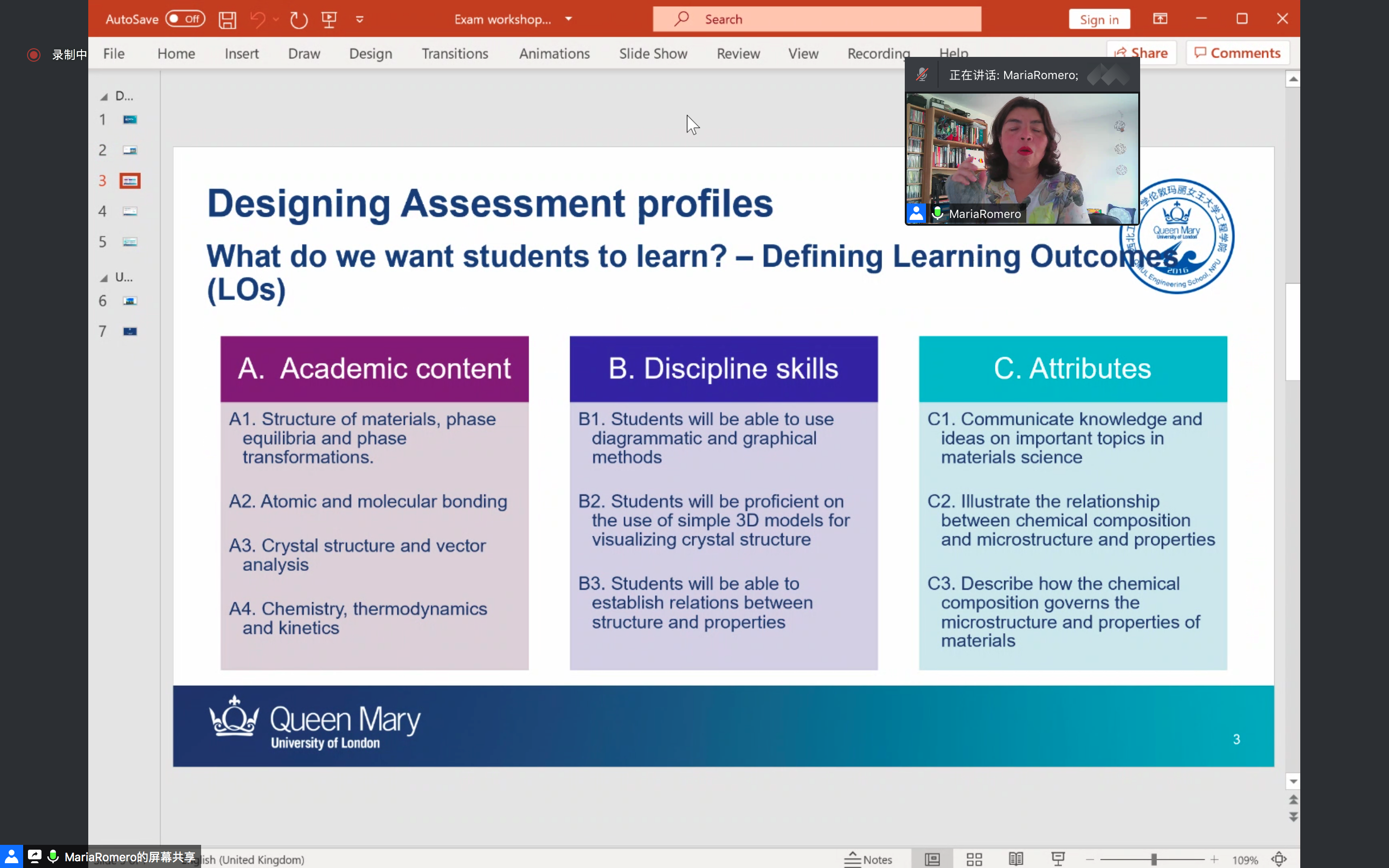 Maria和Colin首先对所有参会老师的到来表示感谢,并对此次专题研讨会进行了介绍,表示课程考核质量监管是教学管理的重要环节。Colin详细介绍了课程考核审查制度的意义、细则、流程和各个阶段的重要时间节点,强调了考核审查制度对于保障教学质量的重要性,并特别指出审查制度对于提升教学交流与授课质量的作用。随后,Maria结合自己的课程,与大家分享了如何科学规划授课内容与进度、考核方式、内容、占比等经验。