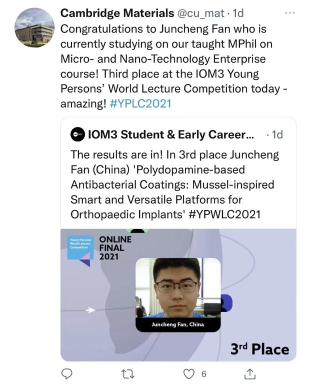 该项比赛于2005年首次举行,长期以来备受世界学术界关注。范峻丞作为唯一一位在读硕士且非英语母语的选手,与来自英国、南非、俄罗斯、马来西亚和加拿大的博士生同场竞技,难度可想而知。他以“聚多巴胺抗菌涂层:以蚌类为灵感的骨科植入智能多功能平台” (Polydopamine-based Antibacterial Coatings Mussel-inspired Smart and Versatile Platforms for Orthopaedic Implants )为参赛课题,由西北工业大学李鹏教授、伦敦玛丽女王大学Liz Tanner教授和Maria Romero-Gonzalez博士共同指导,是极少数以出色的本科阶段研究成果入围全球决赛的员工之一。最终他顶住巨大压力,自信地侃侃而谈,讲解了课题并接受了评委们的提问,最终斩获季军,并收获现金和新版Macbook 笔记本电脑的奖励。而更令他骄傲的,是自己的名字登上了剑桥大学的官网,喜提热搜。