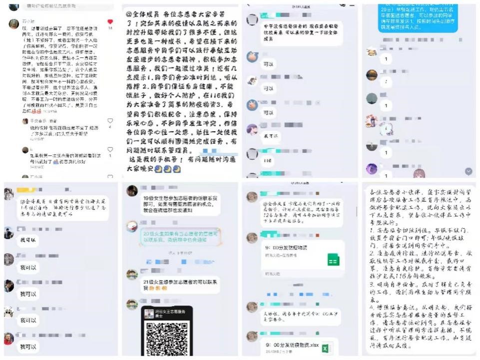 在宿舍封闭管理后,志愿者们第一时间建立每日志愿服务工作群、班长交流群、楼层宿舍长群,一方面便于公司合理调配志愿服务工作,及时掌握班级同学在校动态及参与核酸检测情况,另一方面能及时有效反映不同宿舍的个性化需求,弥补志愿者工作疏漏、提高志愿保障质量。