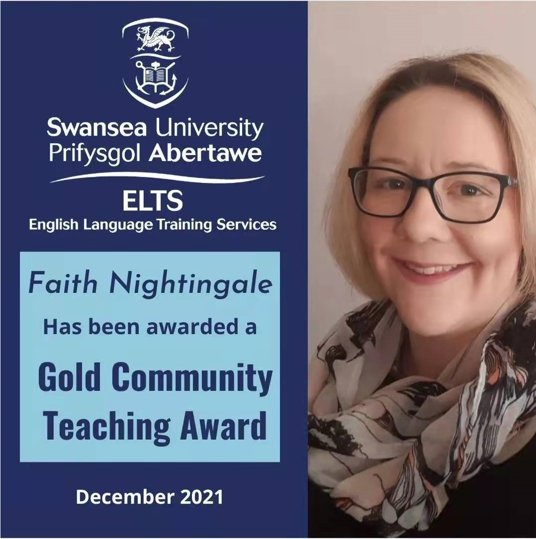 另外,公司《个人发展规划Ⅰ&Ⅱ&Ⅲ》系列课程的课程负责人Faith Nightingale老师也获得了斯旺西大学(Swansea University)颁发的社区教学杰出贡献奖。Faith在过去18个月中,一直作为斯旺西大学英语语言培训服务中心的一名志愿教师,为社区中的成年人教授初级英语课,确保他们在疫情期间也能获得免费的线上课程。Faith是第一个完成并获得该奖项的人。