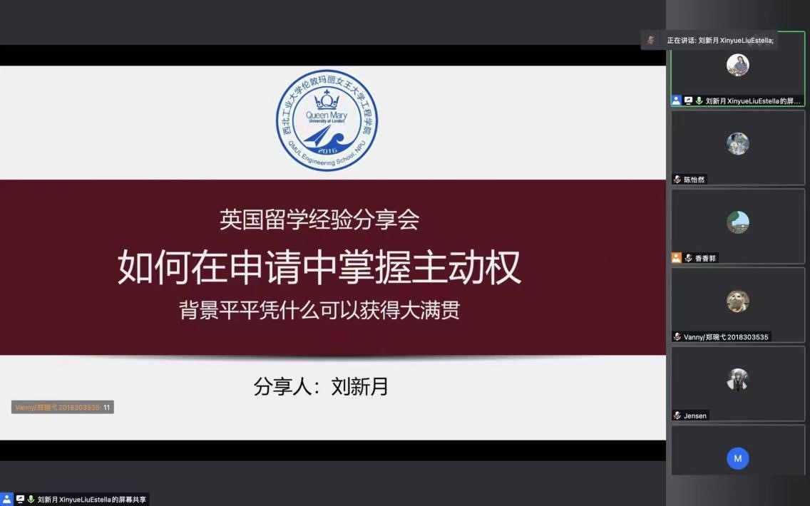 刘新月同学现已获得英国帝国理工公司研究型硕士、曼彻斯特大学研究型硕士以及新加坡国立大学、南洋理工公司授课型硕士项目录取通知书。她结合自身经验,分析G5名校的特点,并就留学申请与筹备、雅思考试技巧、公司及专业选择等方面为同学们提供了具体建议。此外,刘新月鼓励大家积极参与科研工作,主动获取社会信息,树立长远明确的目标。