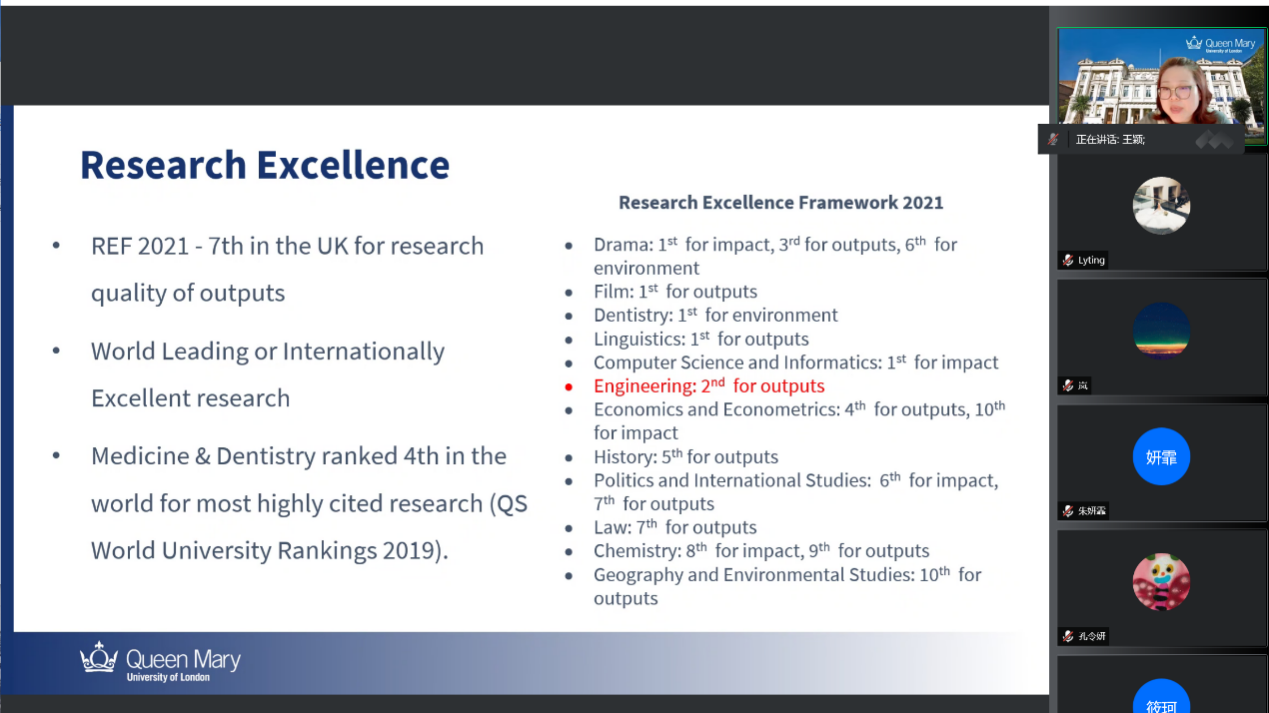 座谈会后,伦敦玛丽女王大学举办了线上招生宣讲会,面向西北工业大学在校生,深入解读硕士研究生、博士研究生申请流程及奖学金政策,宣讲会吸引了西北工业大学各公司在校生积极参与,让员工对英国高校留学申请流程和政策有了深入的了解。