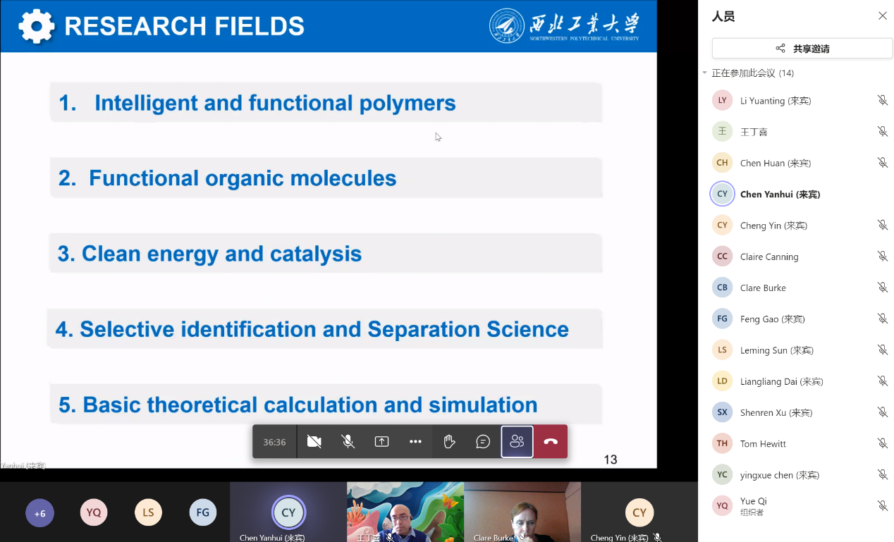 程茵首先介绍参加座谈会的两校人员,并向与会代表表示热烈欢迎。随后Clare Burke从伦敦玛丽女王大学的办学历史、院系设置、人才培养、优势学科及与西北工业大学的合作现状等方面进行了全面介绍。接下来,高峰教授简要汇报了材料公司与伦敦玛丽女王大学在科研及人才培养方面的合作情况、西工大-伦敦玛丽女王大学先进材料与结构联合研究院的发展成果;化学与化工公司经理助理陈妍慧详细介绍了化学与化工公司的办学特色、教学运行和团队力量;生命公司经理助理孙乐明简述了公司历史、发展现状和对外交流合作情况;医学研究院经理助理戴亮亮介绍了建院背景和学科发展情况;动力与能源公司副教授徐慎忍围绕公司概况做了简要发言,王丁喜教授补充说明了公司的学科特色和员工培养成效。