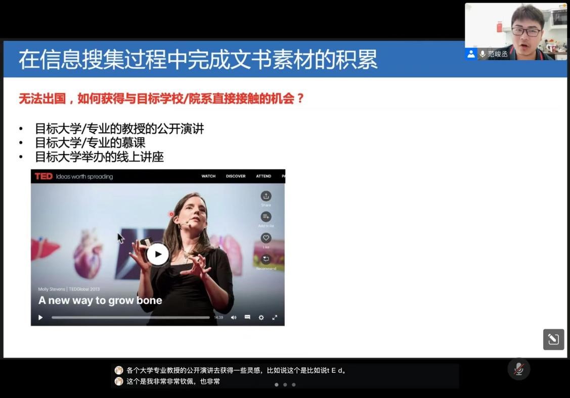 范峻丞介绍了如何运用中外合作办学模式的优势助力自己的留学申请。同时,他也以牛津和剑桥两所高校为例,结合大学的排名和公司的特色,与大家分享了申请文书准备方面的建议,并提醒学弟学妹们,在申请过程中,要主动搜集信息,关注重要时间节点,明确申请动机,理清思路,写出逻辑性强的出色个人陈述。