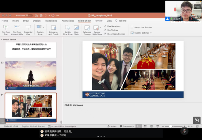 此外,范峻丞指出了英国留学申请中常见的认识误区,并用照片和视频向大家展示了在剑桥大学丰富多彩的学习生活。最后,他鼓励同学们在校期间通过发表研究成果、考取相关专业证书、积极参与实习实践与创新创业活动等方式提升个人竞争力。