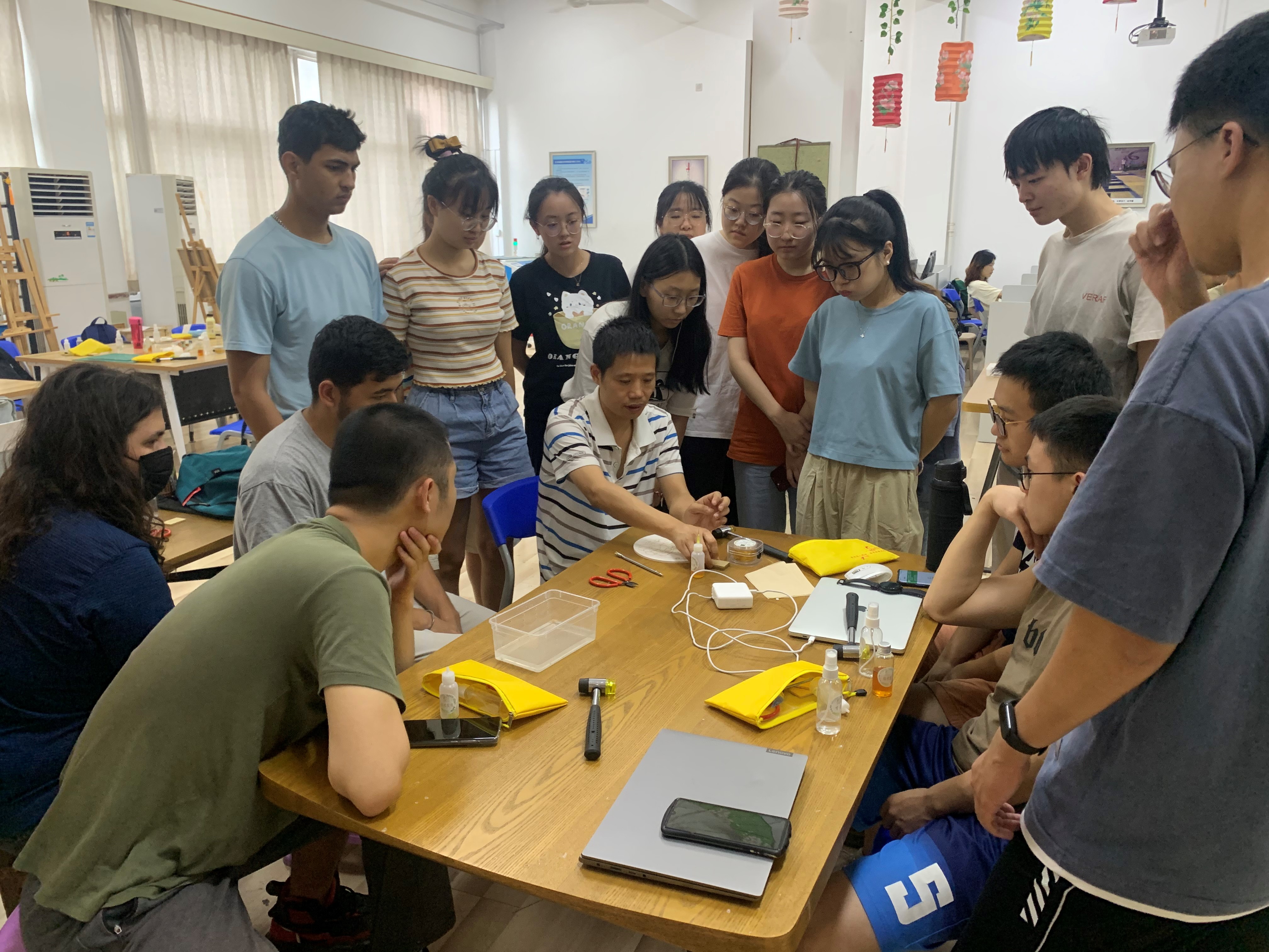 在制作环节中,两位老师融合现代科学技术与中国传统工艺进行实践教学。同学们学习了二维工程软件及图像处理、非金属激光切割机的实践操作。在“喜迎二十大,奋进新征程,建功新时代”主题设计环节中,同学们运用所学知识和技术进行作品设计、图案切割并完成掐丝和上色。这一环节里,同学们不仅初步掌握了CAXA、AI等图像软件的使用和掐丝珐琅工艺流程,更厚植了爱党爱国的情怀,上了一堂生动的“思政课”。实习最后,同学们掌握了用立创软件进行电路设计的方法和小型电子产品焊接装配技术,展示并分享了作品成果。