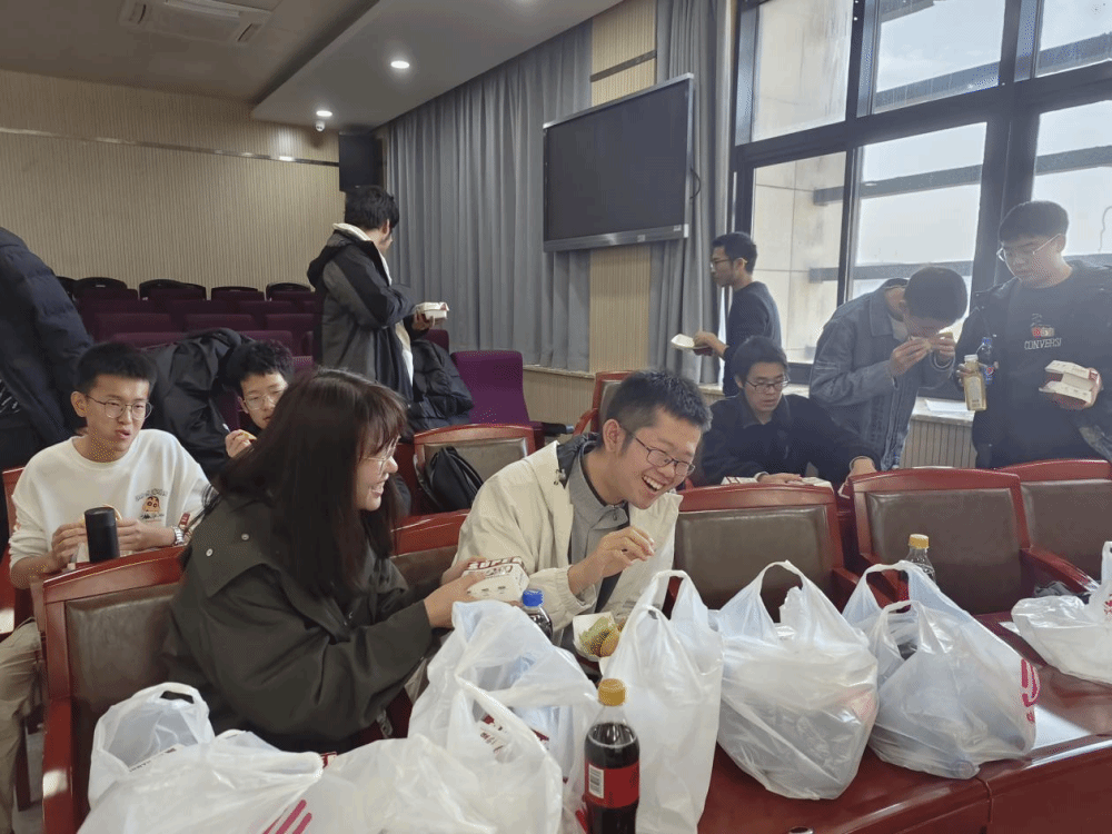 我们只是学习理工科的大一新生,绝大多数人对于表演和舞台可以说是毫无经验。班主任杨烨老师始终陪在我们的身边,看着我们的排练从生疏到熟练,在即将上台的中午为大家买了午饭,欢声笑语充满了排练现场,大家也深受鼓舞,更加坚定了比赛中完美展现的决心。