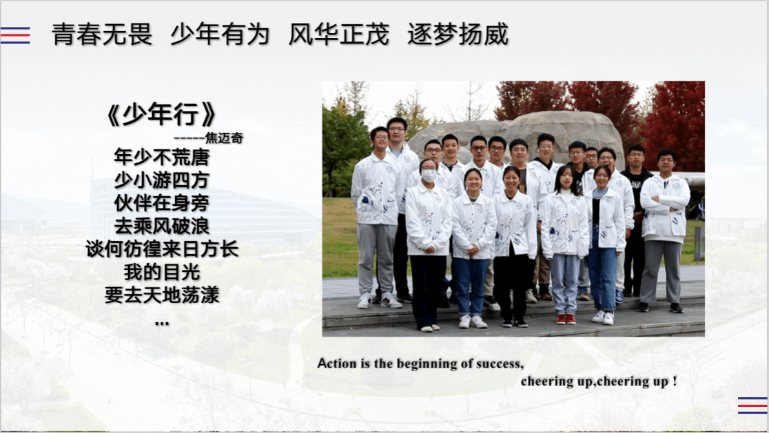 为了充实视频的内容,1班同学们也是八仙过海,各显神通,毫无保留的展示着自己的才艺,在最终的合唱中更是默契配合,全员到场,共同歌唱1班同学们的少年之行。最终,在全班同学的努力下,1班的文化建设汇报得到了公司及评委的认可,被推选参加校级文化风采展示决赛。