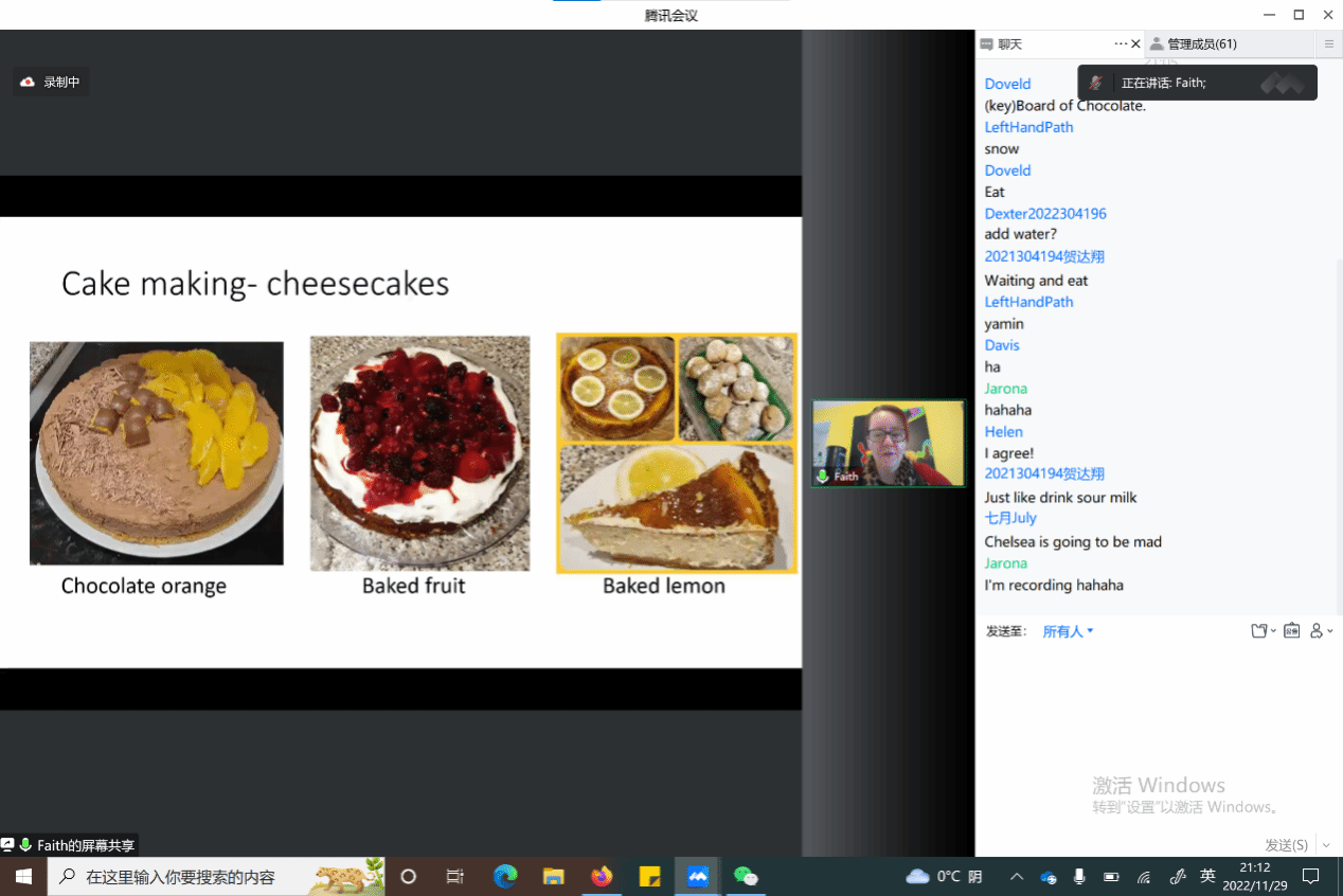 11月29日,第一场活动邀请到深受同学们喜爱的Faith Nightingale老师。Faith老师为本次活动精心准备了丰富有趣的内容,首先,她向同学们介绍了如何制作蛋糕的全过程,以及各类烘焙糕点和特色美食,包括英国餐桌礼仪等文化习俗。同学们热情高涨,纷纷表示本次活动内容精彩,形式新颖,极大地丰富了课余生活。