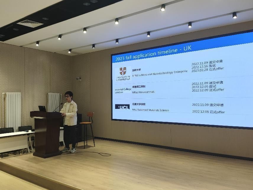 侯思宇结合自身经历讲述了出国见闻,鼓励同学们走向国际化舞台发展,针对剑桥大学纳米技术专业的各项软硬性条件做以解读,并讲解如何使用网络工具查找历年留学数据,并解读了面试过程中的真题,鼓励大家逻辑清晰言之有理并自信的回答问题。