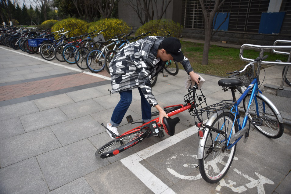 在同学们的齐心协力下,杂乱的共享单车很快被摆放的十分整齐,犹如一道靓丽风景线。在摆放私人自行车时也秉持就近、易寻找的原则,不会在美化校园环境的初衷下给他人造成不便。