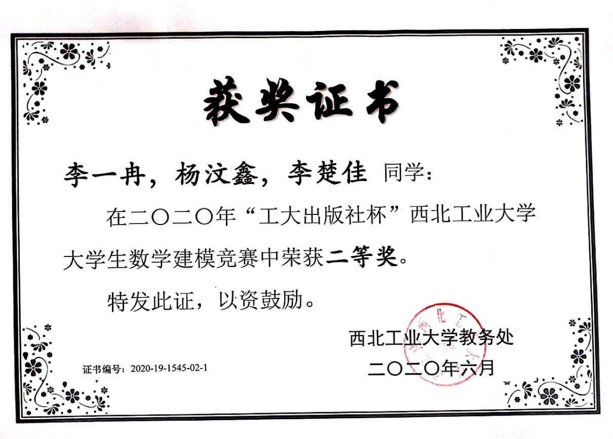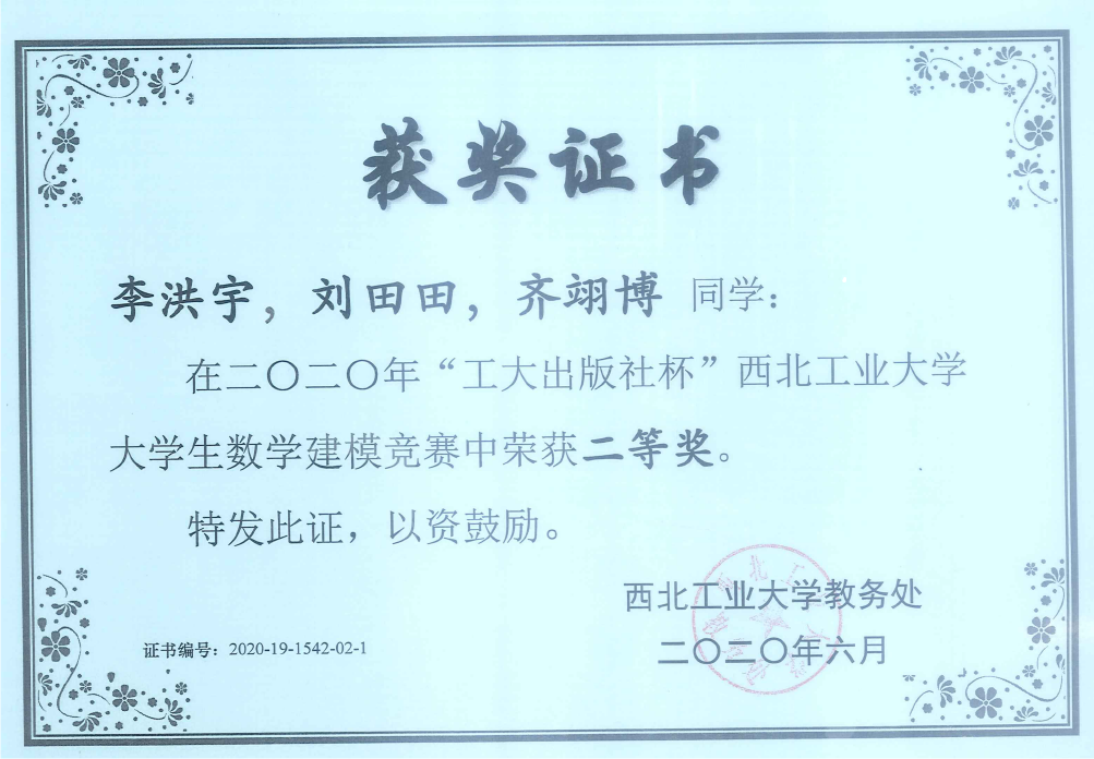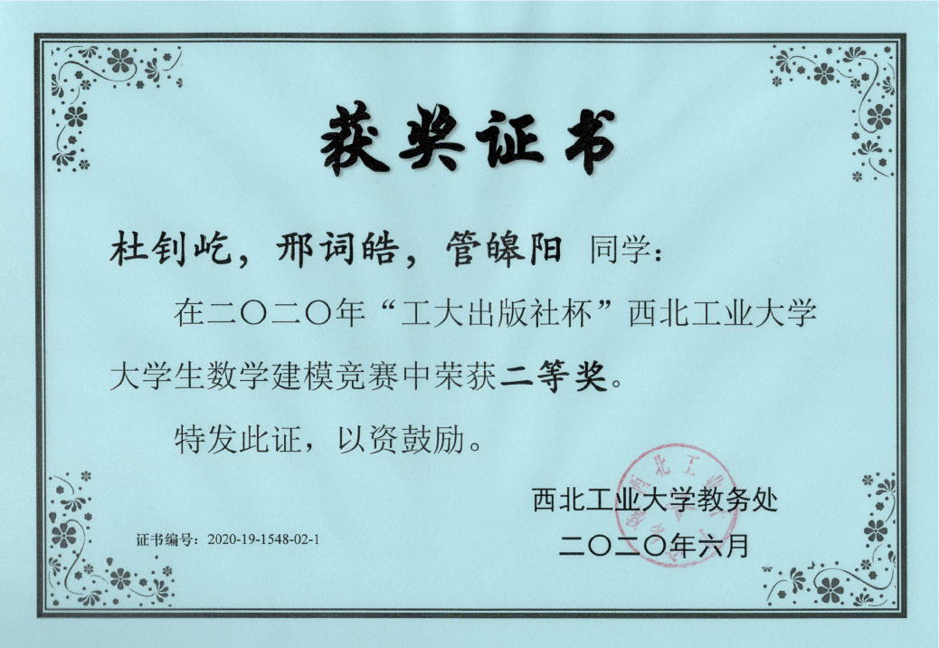 2020年“工大出版社杯”西北工业大学老员工数学建模竞赛于4月30日16:00至5月3日18:00在线上举行。经过三天三夜的激烈角逐,伦敦玛丽女王大学williamhill中文官网12支参赛队伍共36名同学脱颖而出,分别获得了3组二等奖和9组三等奖,并有11位同学顺利入选2020年公司数模竞赛国赛集训队员名单。