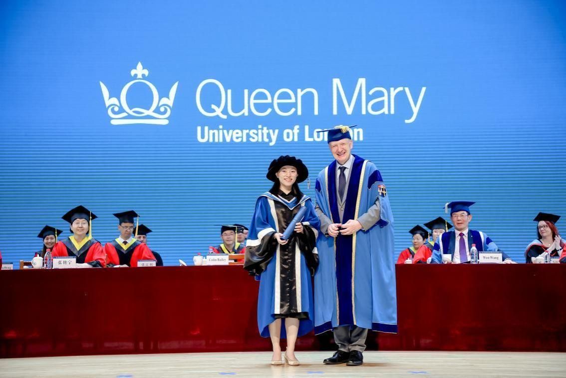 Then, Principal Colin Bailey presented Dr. Deng Xinru with a doctorate certificate. Dr. Deng received her PhD in Materials Science from QMUL in 2019 and was appointed as Assistant Professor at QMES after graduation. She perfectly portrays the role of ambassador of friendship between two universities, two cities and two countries in pursuit of academic excellence by virtue of QMES.