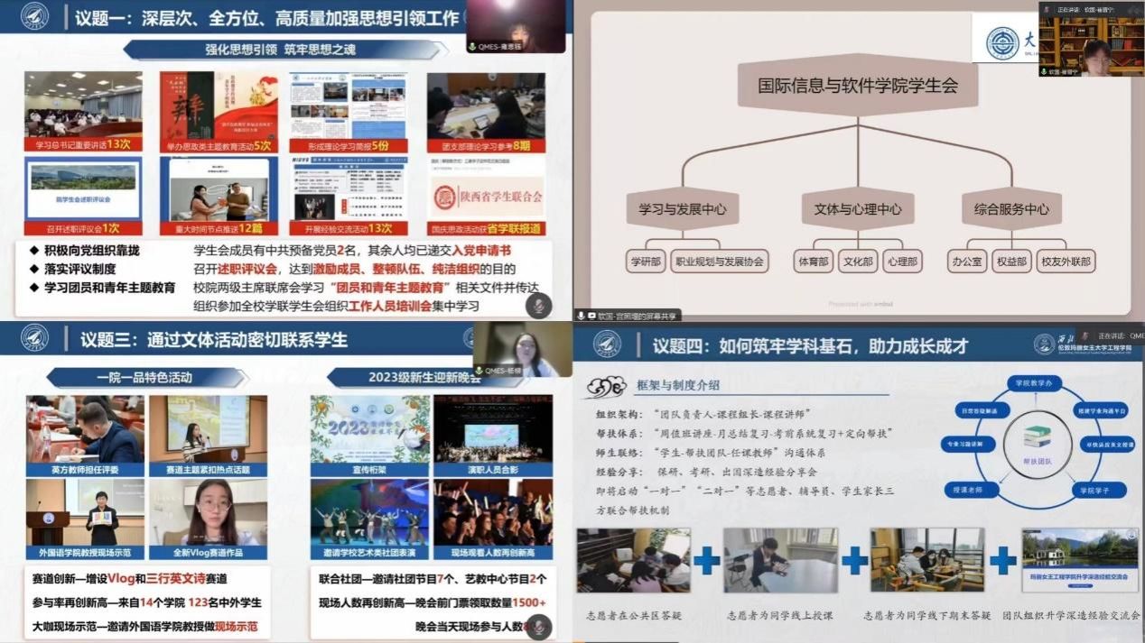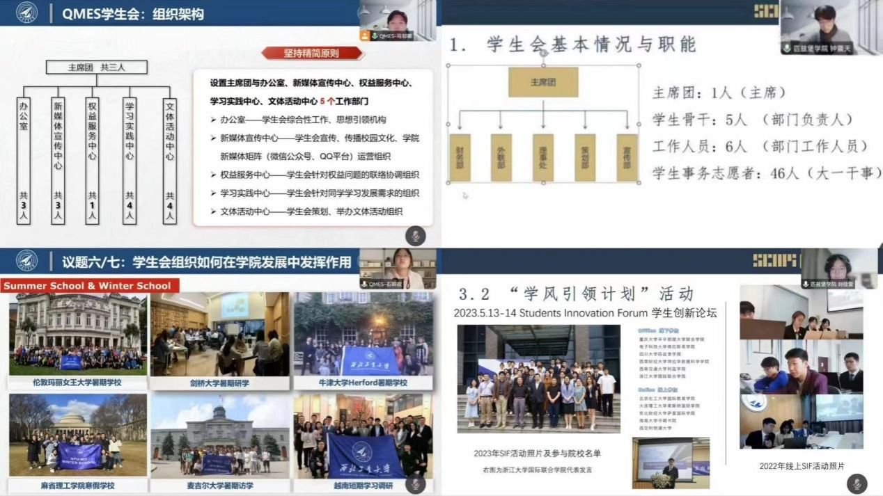In addition, Ma Zhiheng provided an overview of the QMES Student Union from the perspectives of organisational structure, reform effectiveness, internal development, publicity matrix, student services, quality activities, work achievements, and work plans. Following this, Zhong Zhentian, the President of the SCUPI Student Union, and Gong Zhaoyan, the President of the DUT-RU ISE Student Union, shared their respective experiences in areas such as cultural and sports activities, student innovation forums, team building, and personal growth within the college student unions. The SCUPI Student Union also highlighted specific cases of “doing practical things for fellow students”.