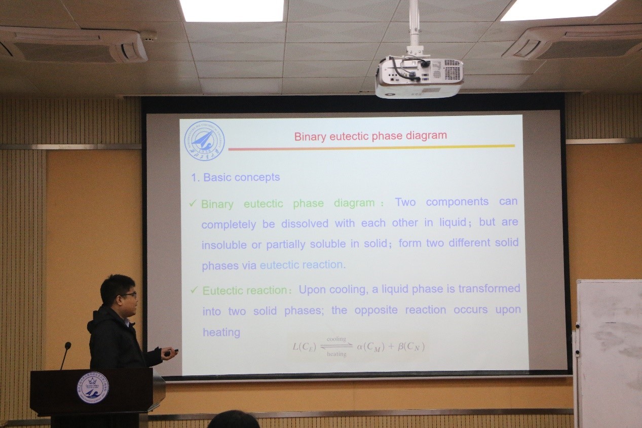 He Yixuan, teacher ofThermodynamics and Phase Transition, introduced the binary eutectic phase diagram in detail from the basic concepts, the analysis of phase diagram, the characteristics of eutectic reaction, and phase transition, so that students could have a deeper understanding of the relevant knowledge of phase diagram and eutectic reaction.