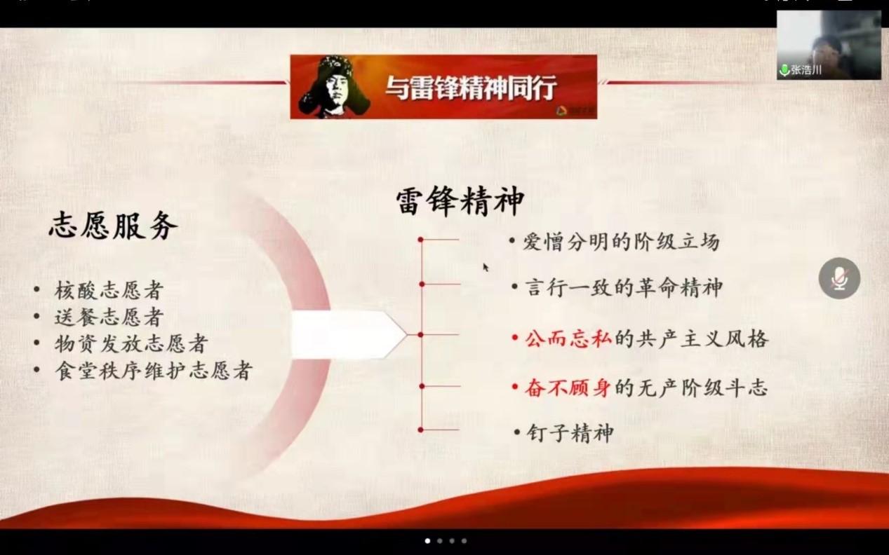 The theme activity of learning from Lei Feng was mainly composed of the launching ceremony and a series of voluntary service activities with the characteristics of learning from Lei Feng.On the afternoon of March 13, the launching ceremony of the theme activity of the Spirit of Lei Feng was held online.First of all, the host Liu Zhening introduced the specific content and participation methods of the event to the participants.Afterwards, several key volunteers including Song Jingyi and Jiao Tian’ao shared their experience during the epidemic prevention and control as well as their volunteer service for the 14th National Games from different perspectives, showing the students what “the Spirit of Lei Feng” meant with practical actions.Finally, Mr. Huang Quanzhang, Secretary of the Youth League Committee of QMES, said that the Spirit of Lei Feng was the accumulation of the traditional virtues of the Chinese nation, the spirit of putting one’s limited life into unlimited service for the people, the spirit of hard struggle based on one’s own work, and the spirit of keeping pace with the times.He hoped that the majority of students would earnestly study the Spirit of Lei Feng and always learn new things with perseverance.