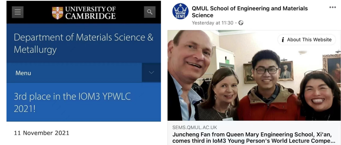 In 2021, the IOM3 YPLC Chinese National Final was hosted by QMES. Fan Juncheng, a 2017 undergraduate student of the school, won the first prize in the Chinese National Final with his wonderful performance and went on to represent China in the global final of the IOM3 YPLC. Fan Juncheng, who currently pursues his study in Cambridge University, won the third place in the global final after navigating through the competition. His success was gloriously reported by the official websites of the University of Cambridge and Queen Mary University of London.