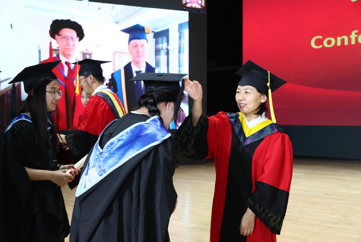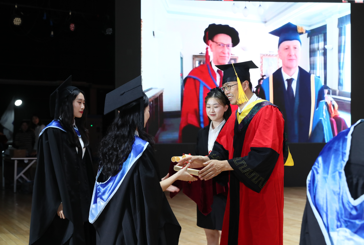 Colin Bailey, President of QMUL; Zhan Hao, Member of the Standing Committee of the NPU Party Committee and Vice President of NPU; Wang Wen, Vice Principal of QMUL and Vice Chair of JAC; Colin Grant, Vice Principal of QMUL; Li Jinshan, Dean of School of Materials Science and Engineering and Member of JAC; Kong Jie, Dean of School of Foreign Studies and Former Member of JAC; Dai Fuping, Party Secretary of QMES and Member of JAC; Wang Jin, Deputy Director of Teaching Affairs Department; Chen Jun, Deputy Director of International Cooperation Office; Zhang Peng, Deputy Director of Finance Department; Xu Weixia, Deputy Secretary-General of NPU Education Foundation; and all the faculty and staff of QMES attended the graduation ceremony simultaneously in Xi’an and London. The ceremony was presided over by Fan Xiaoli, Dean of QMES.