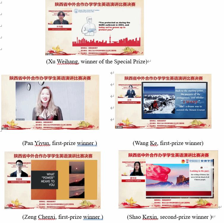 After the comprehensive evaluation of the judges, Xu Weihang from QMES won the special prize of the contest. Pan Yiyun from NWU-Salento School of Cultural Heritage and Arts, Northwest University, Wang Ke from Xidian University Sino-US Program, and Zeng Chenxi from the School of International Education of Xi’an University of Finance and Economics won the first prizes. Shao Kexin from Xi’an University of Architecture and Technology University of South Australia An De College, Liu Yuhan from Chang’an Dublin International College of Transportation at Chang’an University, Zhang Nannan from Ulster College at Shaanxi University of Science & Technology, Li Longxing from Xi’an University of Architecture and Technology University of South Australia An De College, Suo Jiadi from Sino-foreign Cooperative Project of Electronic Information Science and Technology of Northwest University, Zhu Siying from College of Natural Resources and Environment of Northwest A&F University won the second prizes. 9 students are winning the third prize, including the students of Chen Yiwen from QMES.