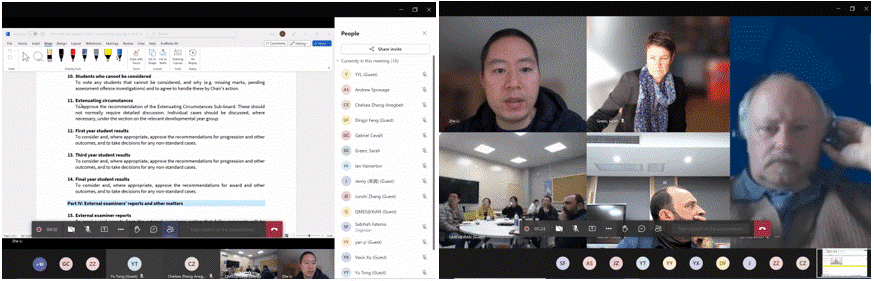 QMES held the final examination committee meeting for the autumn semester of 2022-2023 academic year at 17:00 on March 17, 2023 through both online and offline ways. Professor Fan Xiaoli, Dean of QMES, Associate Professor Gabriel Cavalli, Executive Vice Dean of QMUL, Professor Li Zhe, Director of the Examination Committee, External Review Expert Professor Sarah Green, Dr. Ian Hamerton and Dr. Jonathan Leader, and module convenor of this semester and staff of teaching affairs offices of both sides attended the meeting. The meeting was presided over by Professor Li Zhe.