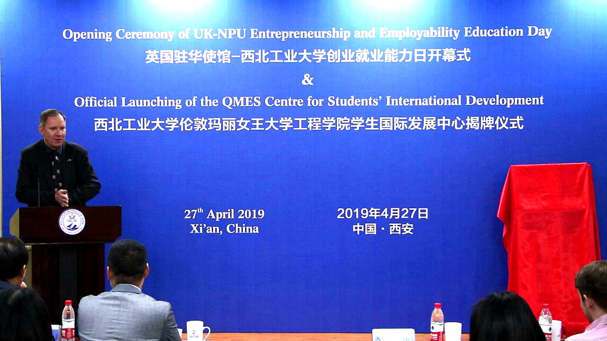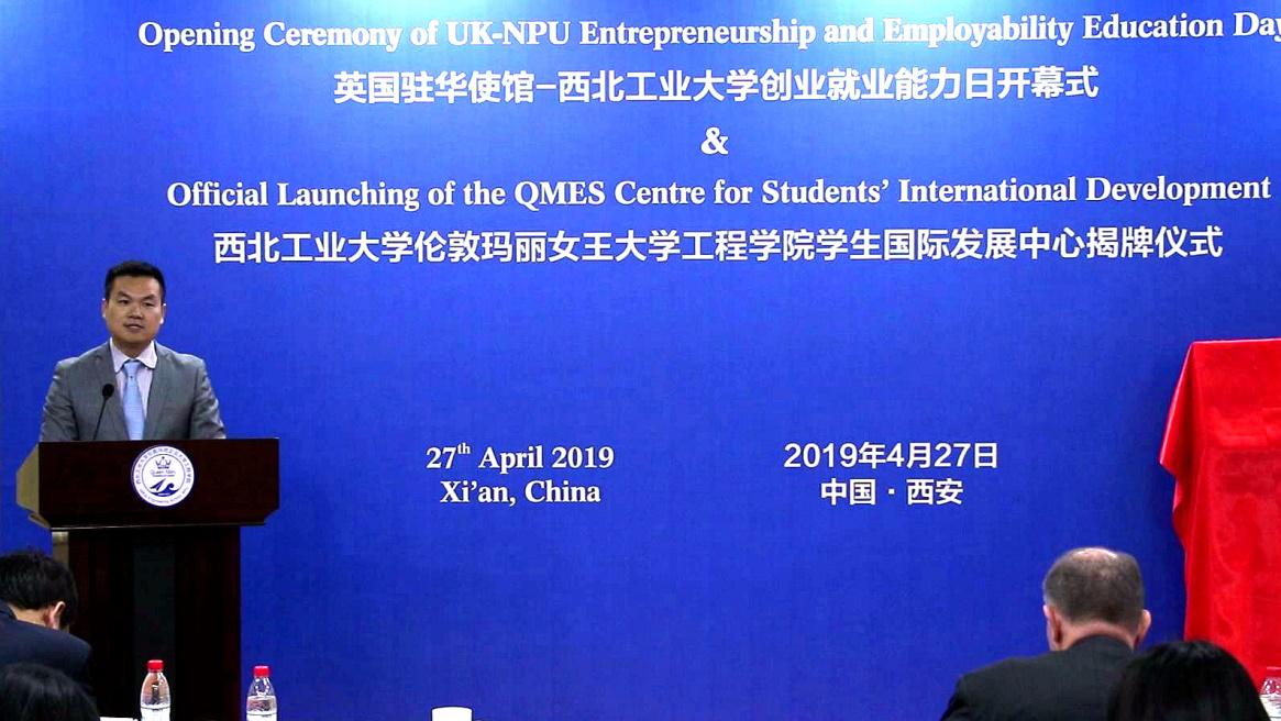 TheOpening Ceremony of UK-NPU Entrepreneurship and Employability Education Day & Official Launching of theCentre for Students' International DevelopmentofQueenMarry University of London Engineering School, NPU (QMES)was successfully heldon April 27th, 2019 in Chang'an Campus, Northwestern Polytechnic University (NPU).The eventwas co-hostedby the British Embassy in China and NPU, and jointly organized byOffice of International Cooperation, Teaching Affairs Department, Undergraduate Student Affairs Department ofNPU,NPU Youth League Committee and theQMES.