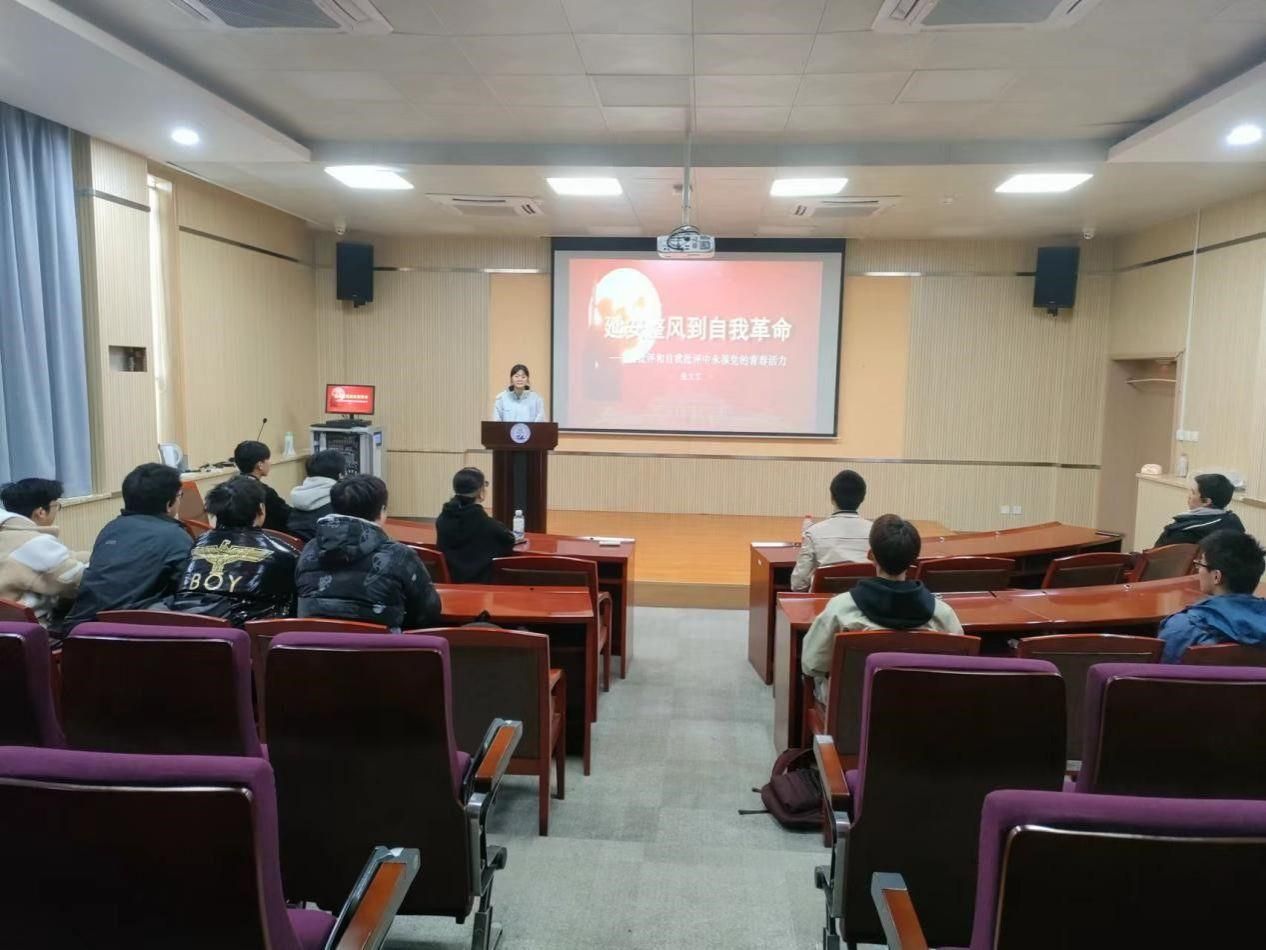 First, Zhang Wenyi, a member of the publicity team, led students to review the history of the development of CPC. In order to make students further understand and grasp the scientific connotation of the self-revolution of CPC, Zhang Wenyi led students to review Yan’an Rectification Movement launched by Mao Zedong in 1941 and Xi Jinping’s View about How the CPC Gets out of the Important Discourse of Historical Periodic Rate in the report of the 20th National Congress of CPC in 2022. Subsequently, Zhang Wenyi combined with Mao Zedong’s report “Reform Our Study” and other contents to introduce the important role of self-revolution in maintaining the purity of the party. Finally, Zhang Wenyi concluded that not being afraid of sacrifice is a vivid interpretation of the self-revolution spirit of CPC, and the courage to conduct self-revolution is the powerful internal driving force of the CPC.