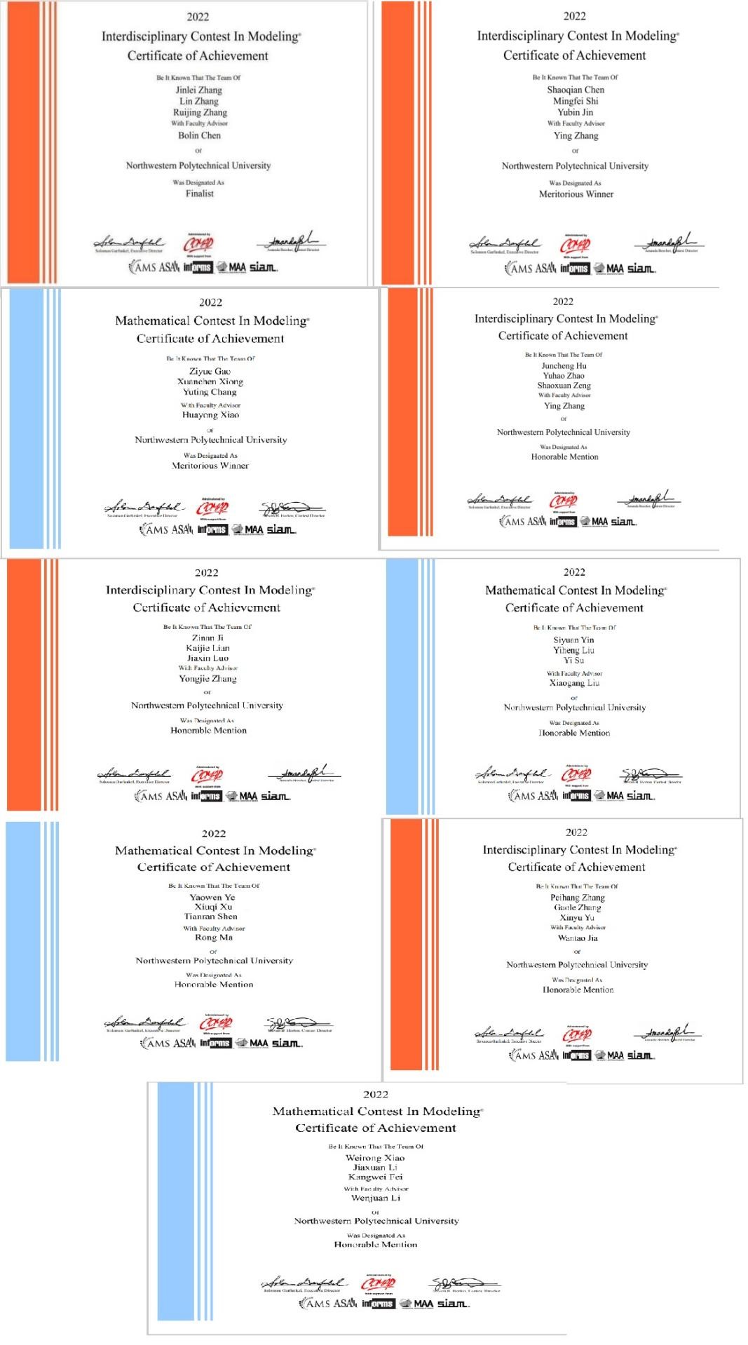 The 2022 Mathematical Contest in Modeling andInterdisciplinary Contest In Modeling (MCM/ICM) was held from February 17 to 21, 2022, Beijing time. On behalf of NPU, a total of 197 teams and 591 students participated in the contest, and won 4 Finalist(F) Prizes and 14 Meritorious(M) Winners. Among them, Zhang Lin, a 2019 undergraduate student of QMES, won Finalist Prize, 3 students including Gao Ziyue, Xiong Xuanchen and Chen Shaoqian were Meritorious(M) Winners, and 12 students including Zeng Shaoxuan, etc won the Honorable(H) Mentions. A total of 27, 205 college teams from 22 countries and regions participated in this competition, and more than 81,000 college students participated. Totally, there were 44 Outstanding(O) Winners, 684 Finalists(F), 1797 Meritorious(M) Winners and 5803 Honorable(H) Mentions in the contest. Among them, the winning rate of Outstanding Winner is only 0.16%, and the winning rate of Finalist Award is only 2.5%.